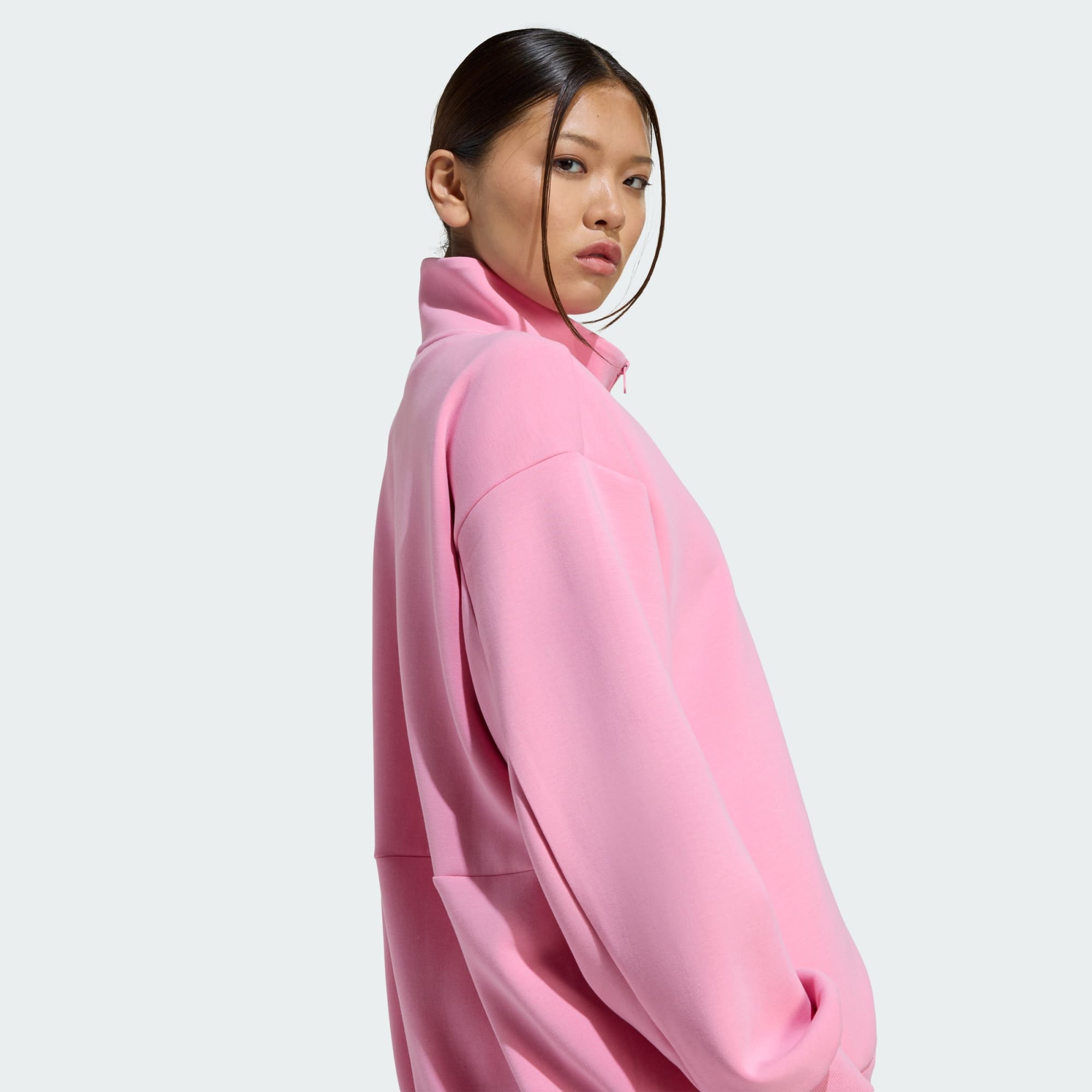 Este top adidas com zíper integral é feito de um tecido macio em pêssego para uma sensação aconchegante. A forma solta e o comprimento estendido fazem dele a peça perfeita para um look descontraído e relaxado. A gola alta e o zíper frontal permitem que você ajuste a cobertura durante o dia.