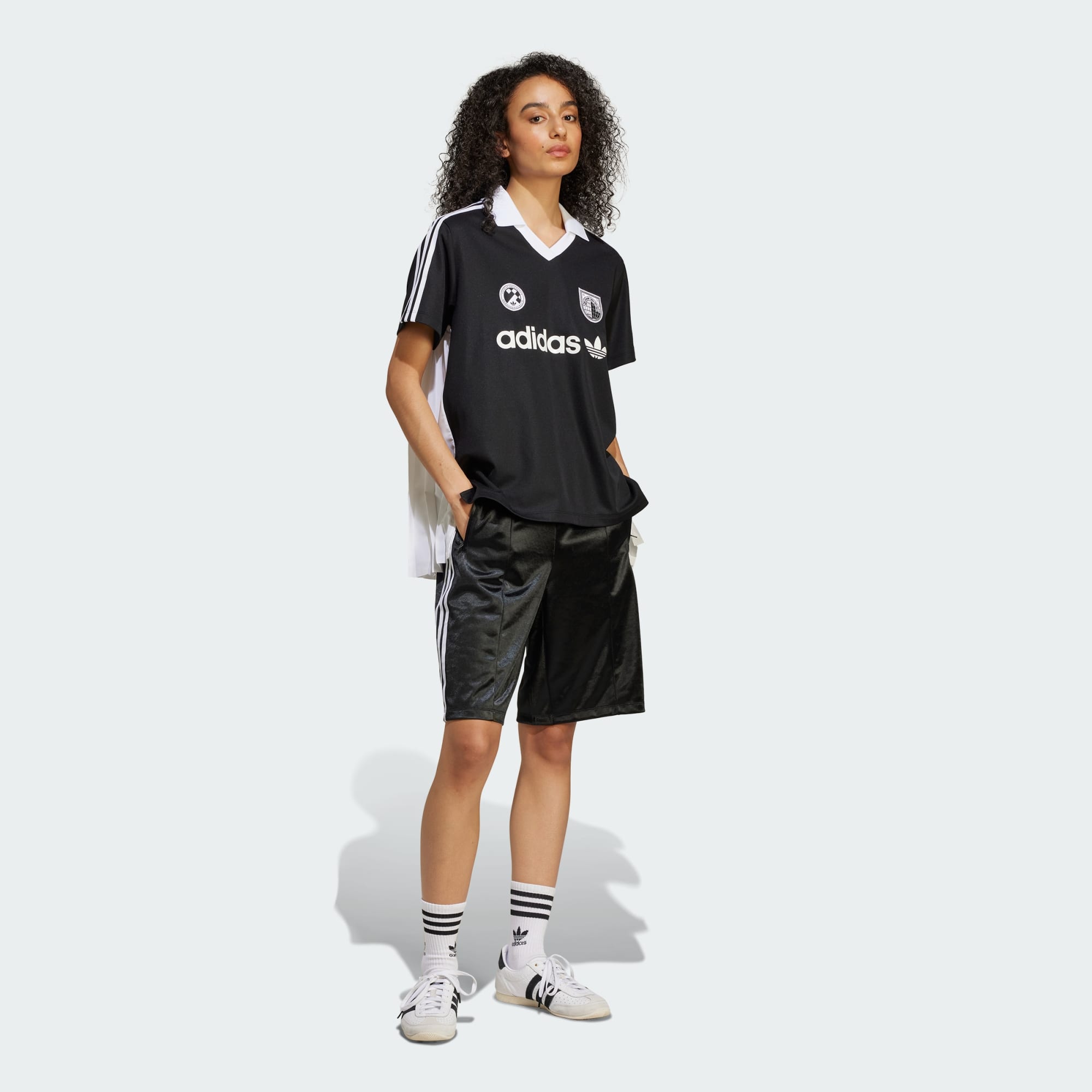 A camisa adidas Originals R3CD dá energia feminina a uma silhueta clássica. Brincando com o contraste, as costas se destacam em uma cor e material diferentes, com pregas suaves que contrastam com a estética futebolística mais tradicional na frente. Os logos e escudos adidas destacam-se no peito, imitando o estilo de uma camisa do time.