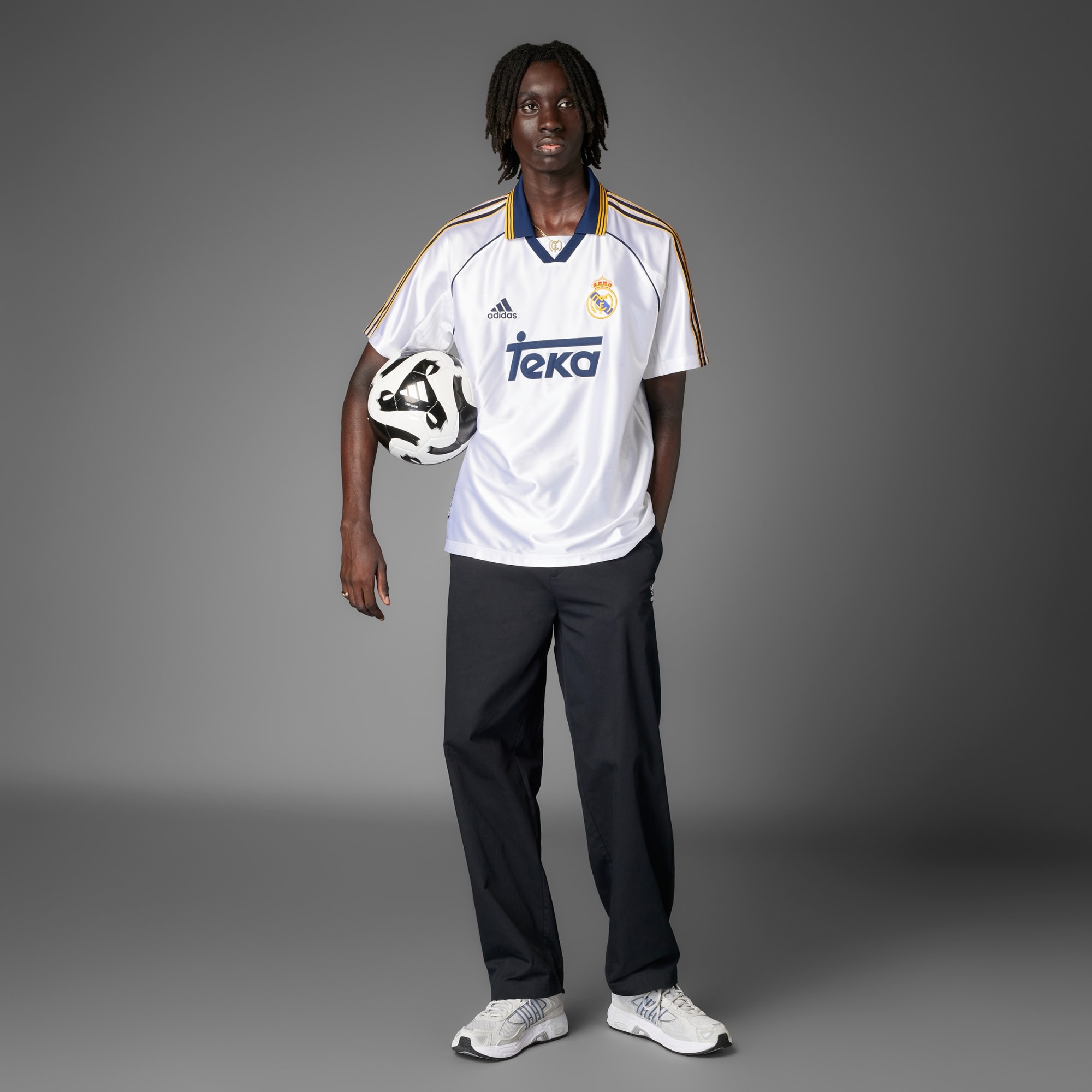 Reviva o triunfo mágico do Real Madrid com esta versão fiel da camisa 1 de 99/00 do time. A camisa da adidas, usada pelos jogadores antes de celebrar com o troféu de futebol mais valioso da Europa em Paris, une a gola Henley a uma modelagem folgada clássica. Costurado no peito, o escudo do clube apropriado para a época acrescenta o detalhe final a uma camisa que é perfeita para torcedores dedicados e fashionistas do futebol.
