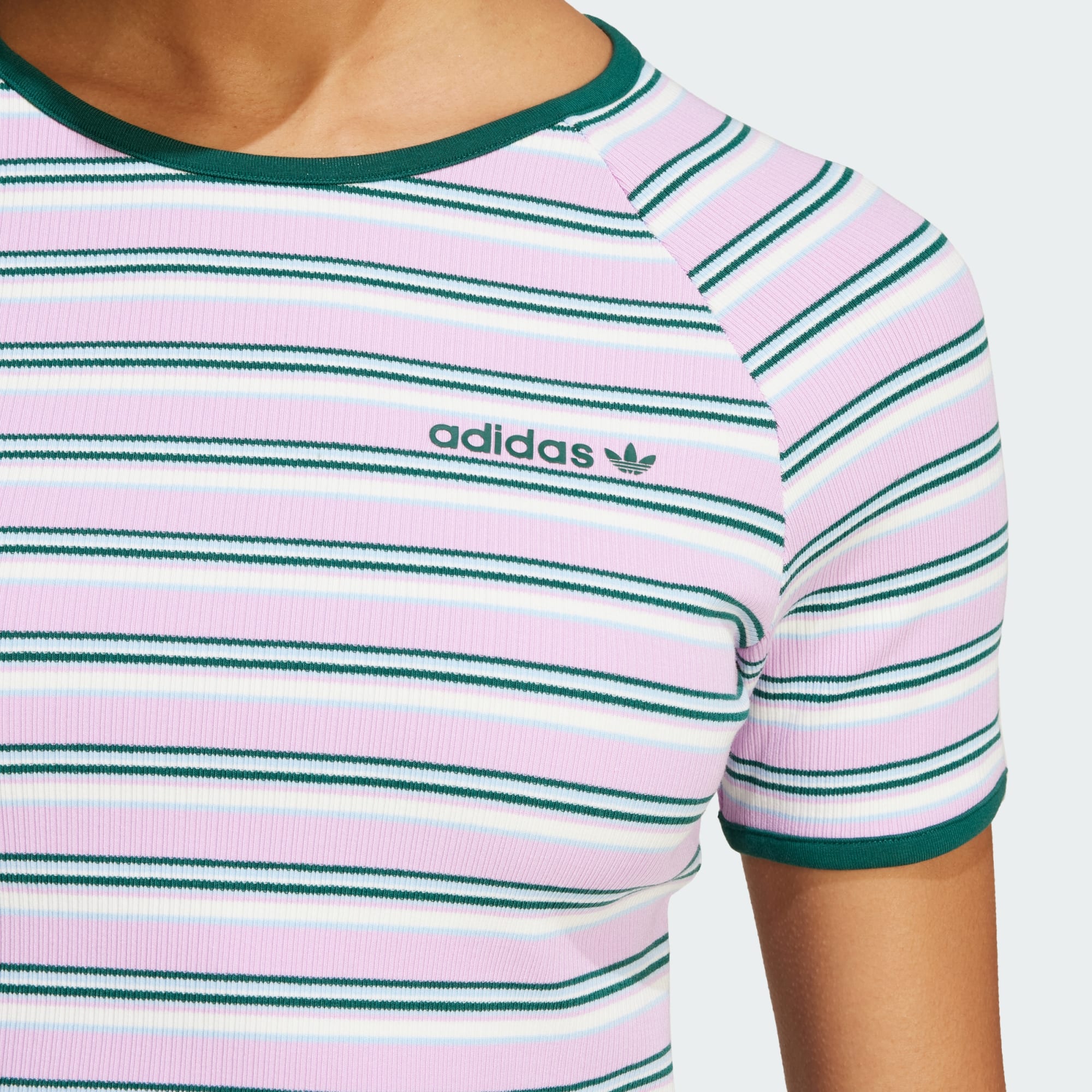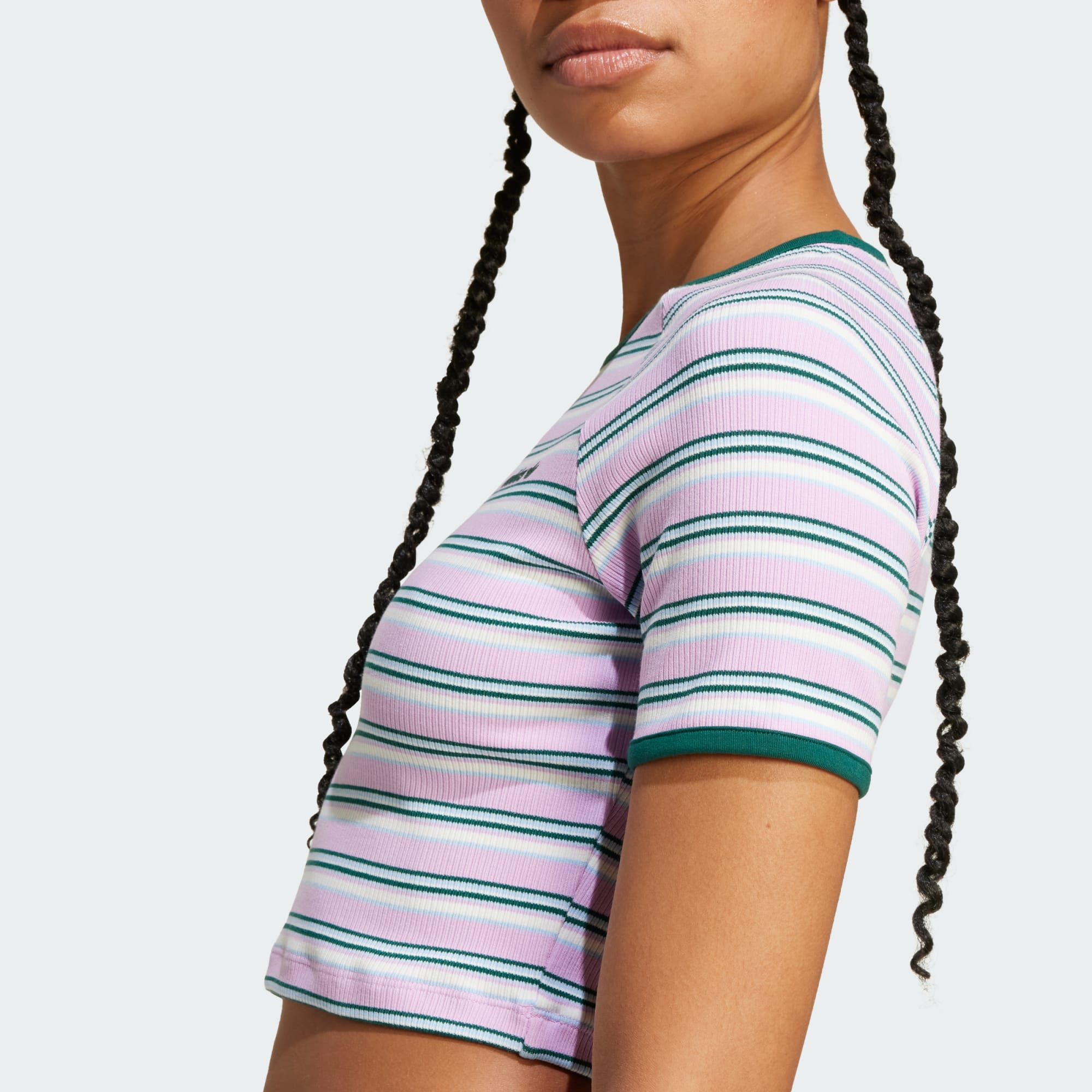 Sua peça favorita do guarda-roupa está prestes a enfrentar uma concorrência. Bonita e confortável, esta camiseta baby look adidas foi desenvolvida para acompanhar seus movimentos, graças ao tecido canelado e à modelagem justa. As listras coloridas são pontuadas por um pequeno logo Trefoil no peito que sinaliza sua conexão com criadores e atletas do passado. Combine com jeans de cintura alta para uma corrida casual no café ou use com uma calça jogger para uma noite mais aconchegante. Seja qual for o seu estilo, a sensação de maciez e elasticidade faz dela uma peça básica. O algodão deste produto foi obtido por meio da Better Cotton. O algodão Better Cotton é obtido por meio de um modelo de cadeia de custódia chamado de equilíbrio de massas. Isso significa que o algodão Better Cotton não é rastreável fisicamente até os produtos finais. Saiba mais aqui: https://bettercotton.org/who-we-are/our-logo/