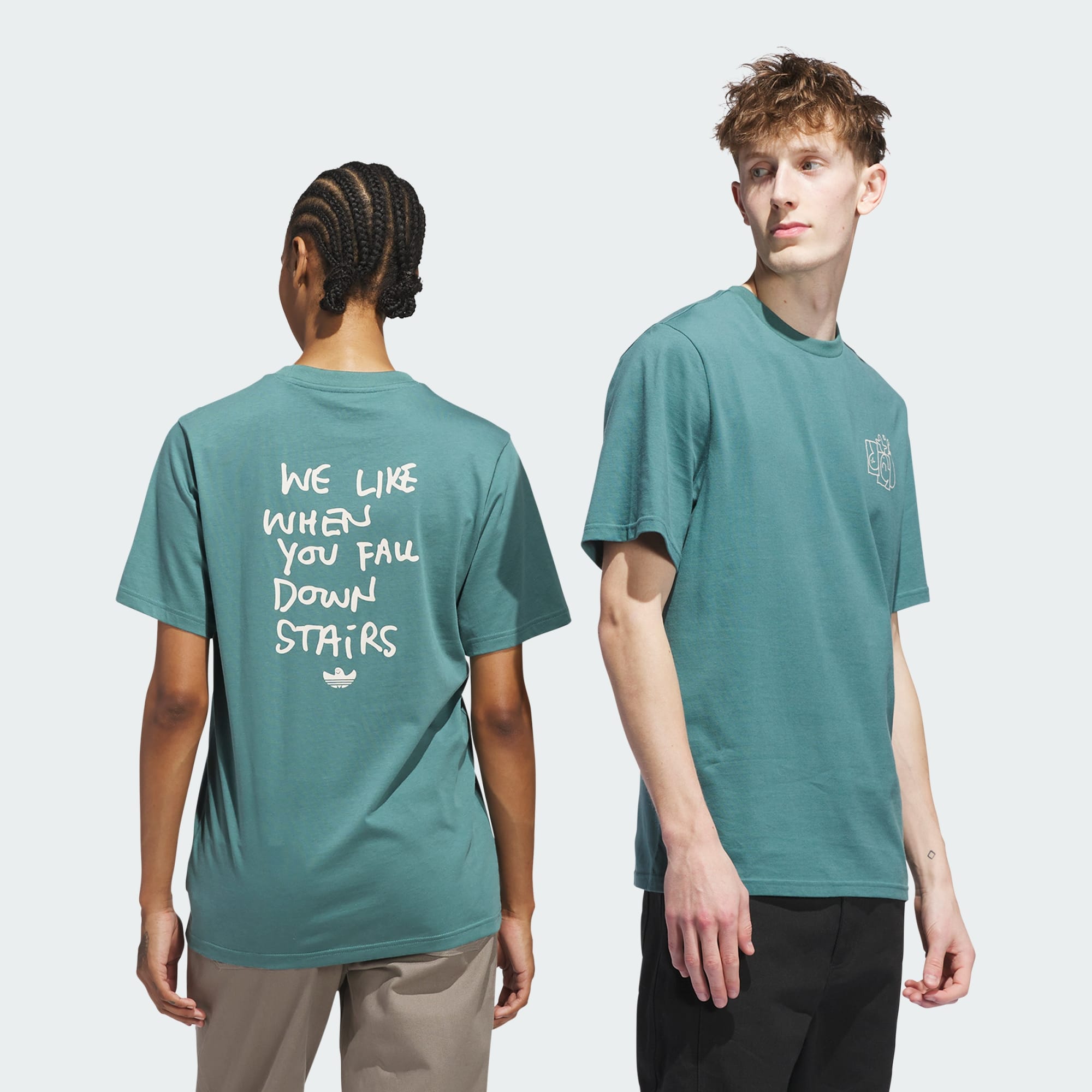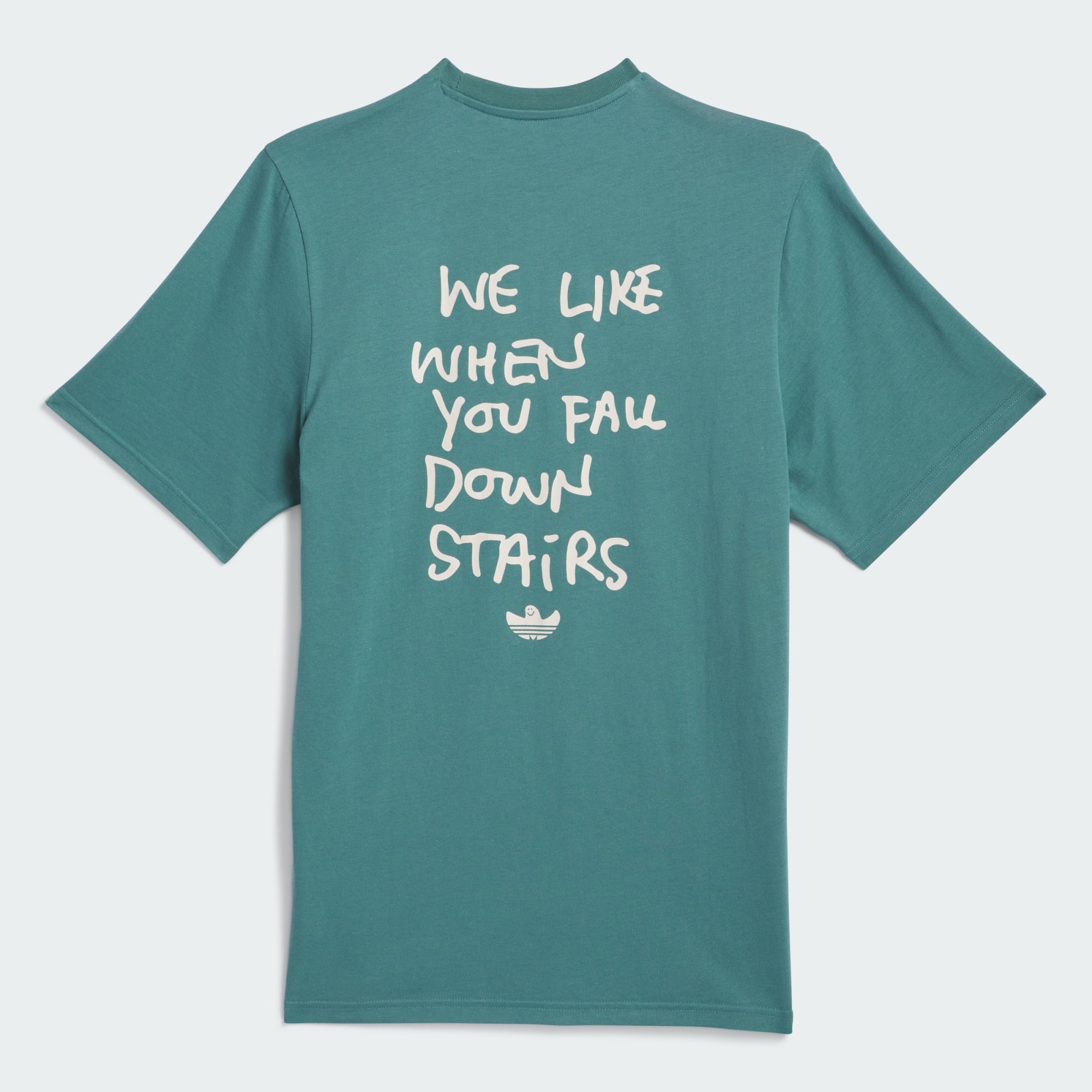 Criada com um ajuste básico e materiais confortáveis 100% algodão, a camiseta Shmoofoil Stairs apresenta arte personalizada e uma chamada para ação da lenda do skate da adidas, Mark Gonzales.