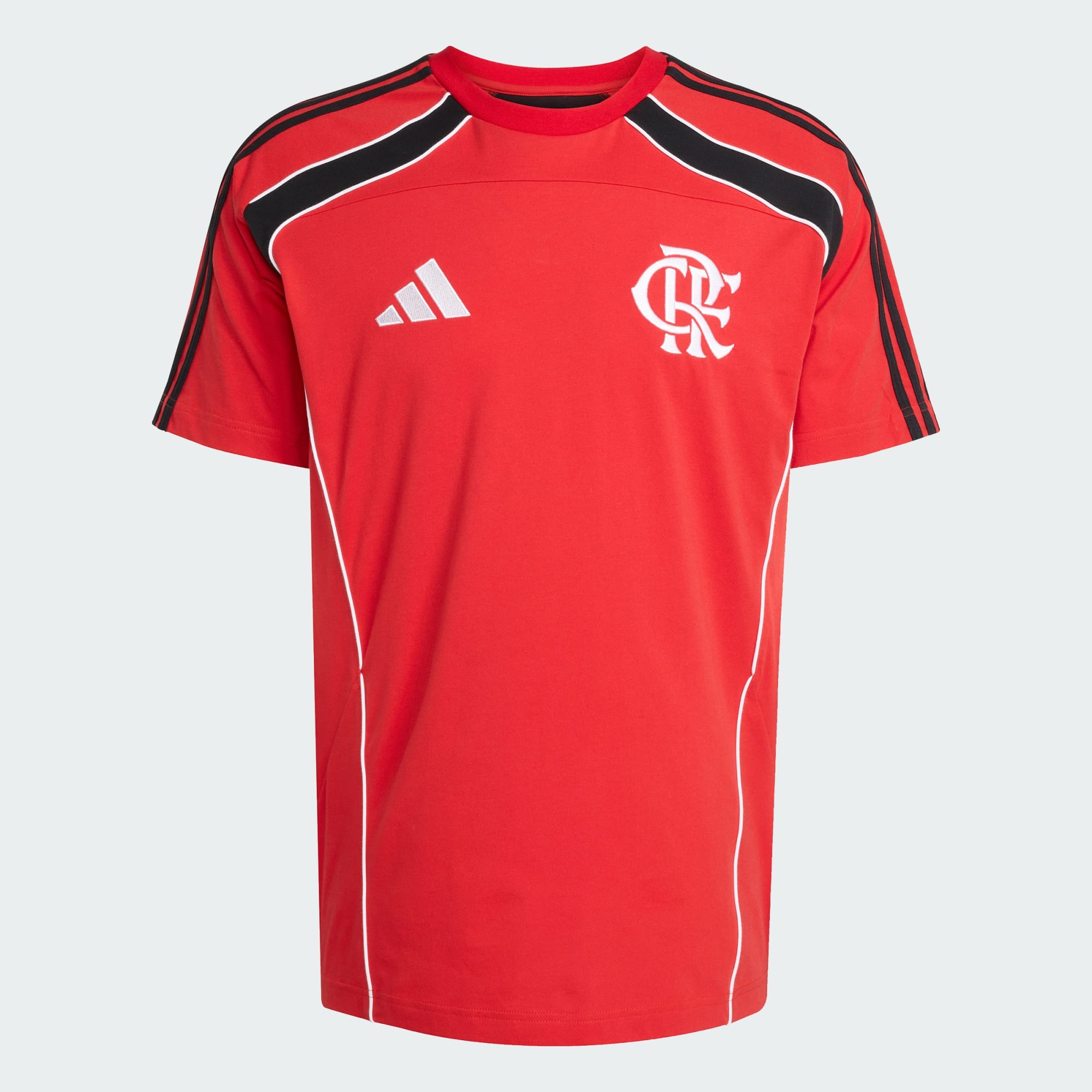 Cores do CR Flamengo. Estilo retrô adidas. Esta camiseta de futebol se inspira nas modas dos dias de jogos da última década. Sua construção em malha simples e o importante brasão do time fazem dela um substituto perfeito para a sua preciosa camiseta de malha de jogo.