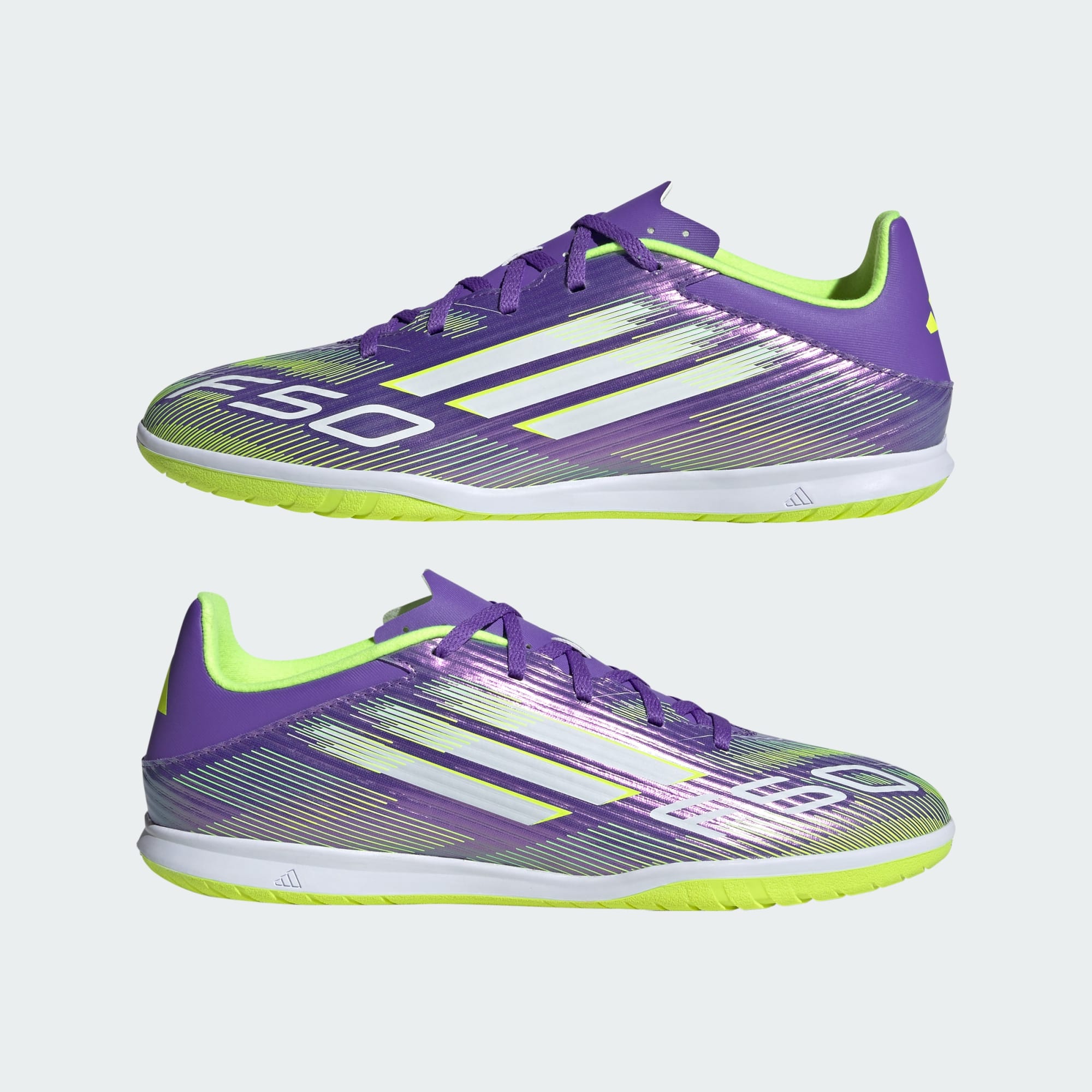 Encontre a sua velocidade para se expressar nas quadras. Sinta a adrenalina com a chuteira adidas F50, desenvolvida para velocidade. Esta chuteira mantém você confortável em movimento com o cabedal de suporte Fiberskin e a língua perfurada. Vire a chuteira e você encontrará o solado de borracha aderente que oferece suporte para jogos rápidos em superfícies lisas indoor.