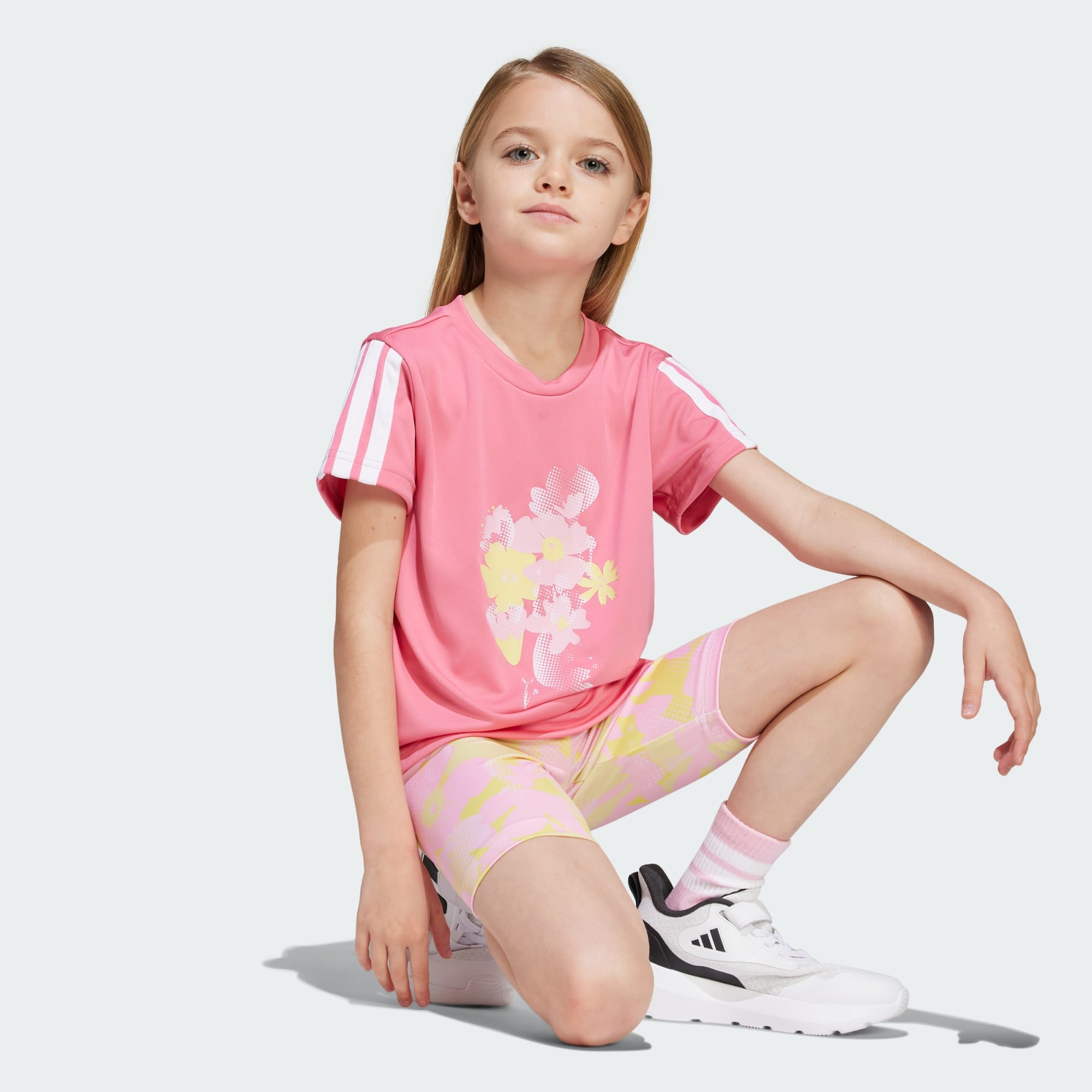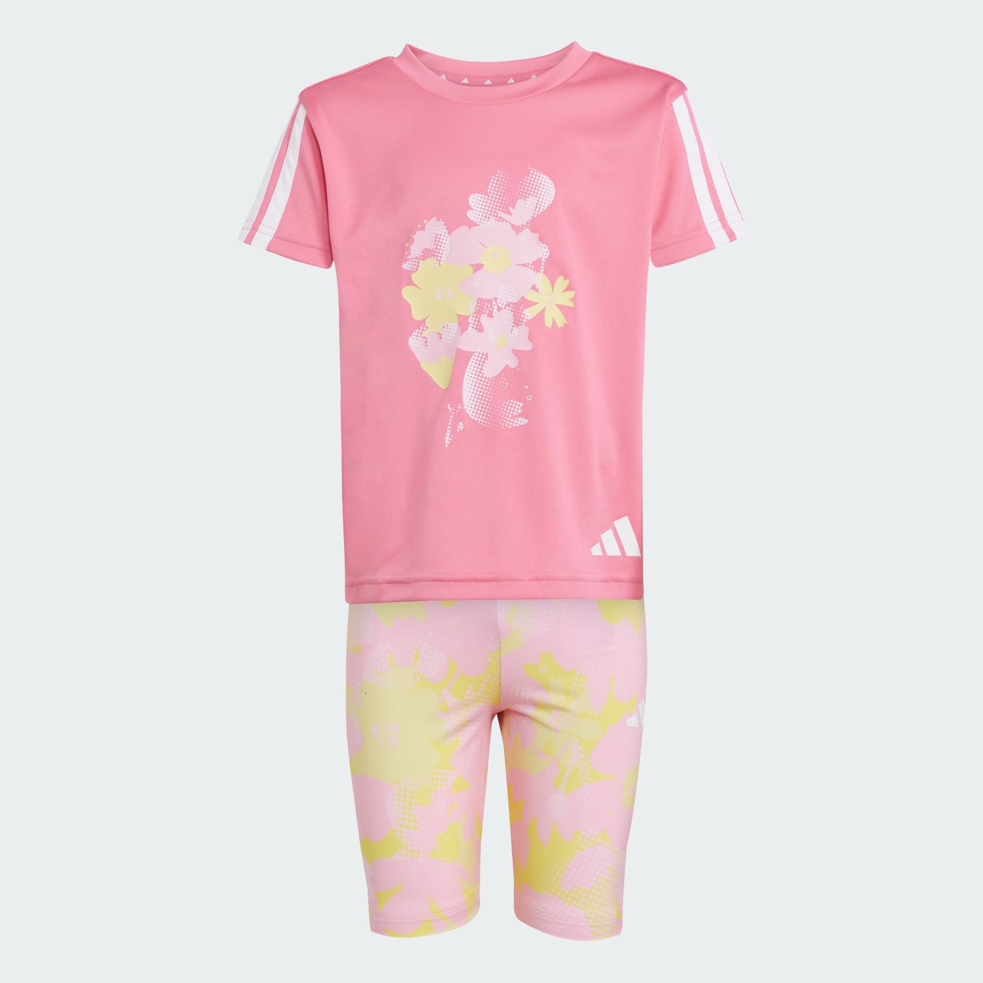 Este conjunto infantil adidas traz o poder das flores para os dias de hoje. A camiseta de malha com estampa floral oferece conforto respirável durante as brincadeiras. O shorts legging tem uma estampa floral corrida coordenada. CLIMACOOL absorve e dispersa o suor para uma performance fresca, seca e sem distrações. CLIMACOOL ajuda você a controlar o suor com materiais que removem e controlam o suor rapidamente. Suas fibras de secagem rápida dão a você uma sensação de pele fresca.