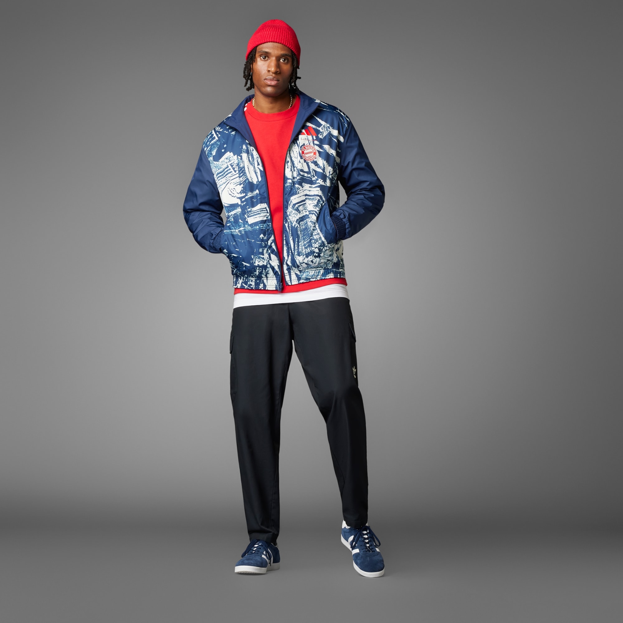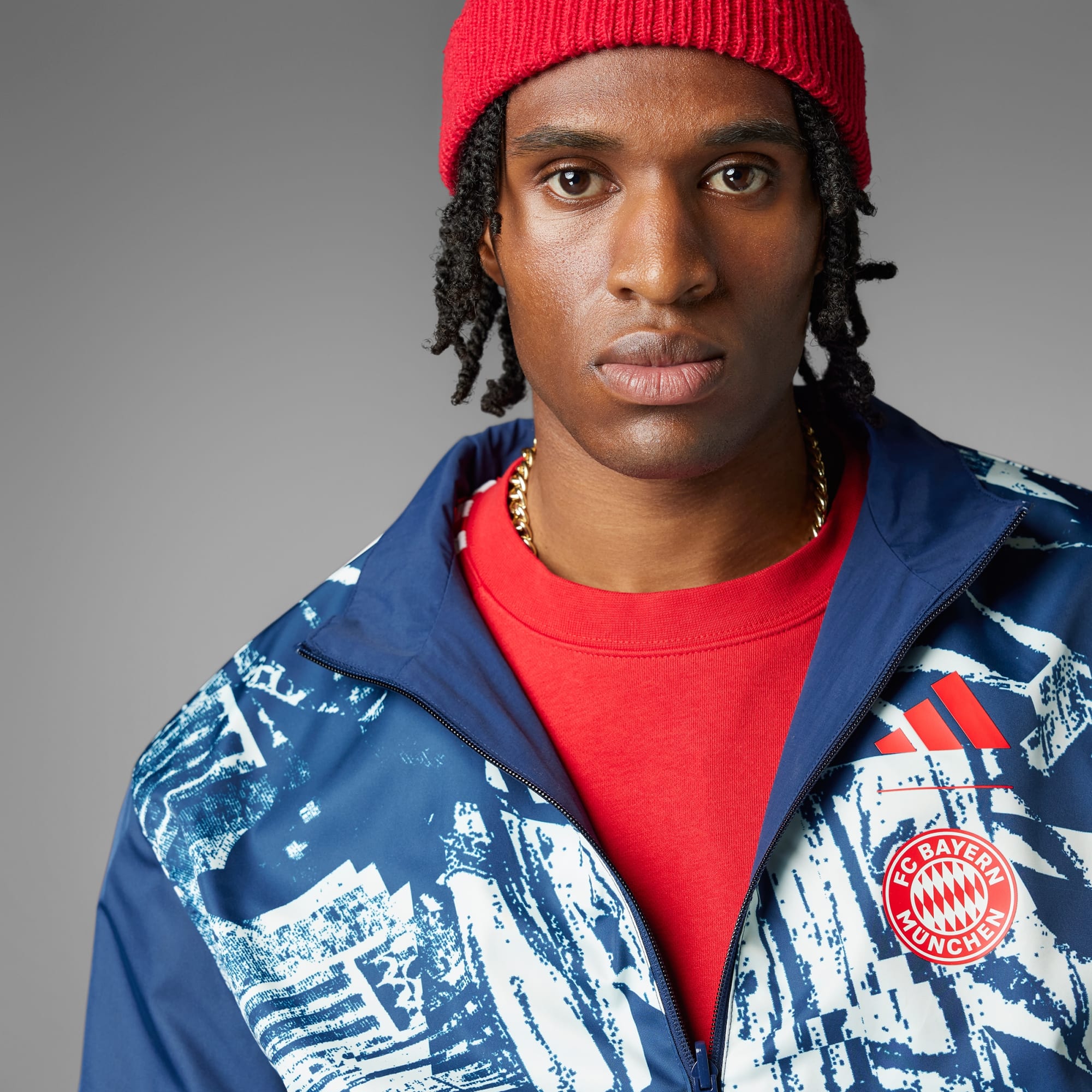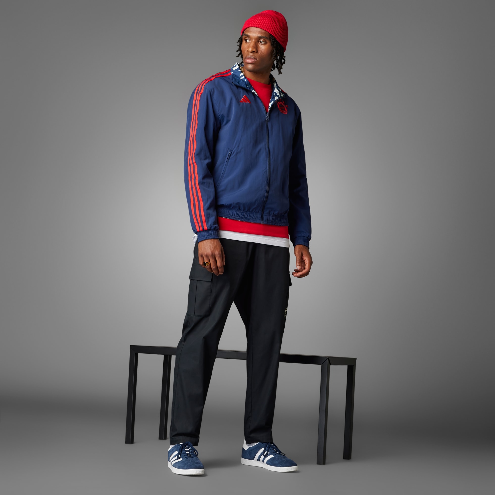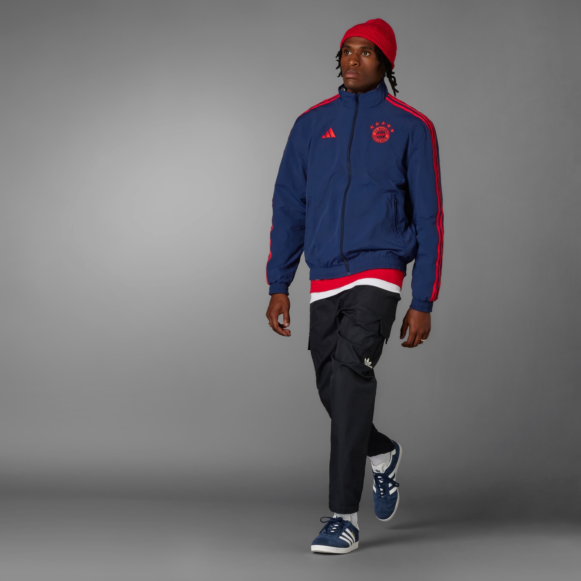 Uma jaqueta. Duas histórias. Sempre pronta para qualquer ocasião. Deixe claro para quem você torce com esta jaqueta hino do FC Bayern. Desenvolvida com design reversível, ela permite que você escolha entre duas estéticas icônicas, tornando as coisas mais divertidas nos dias de jogo. Uma mistura perfeita de funcionalidade e estilo, ela inclui bolsos com zíper para guardar os seus objetos essenciais e gola alta para ajudar a proteger contra o frio. A barra e os punhos elásticos garantem uma sensação de firmeza, enquanto o escudo do clube bordado e o logo de alto desempenho destacam quem a veste. Feito com uma série de materiais reciclados e pelo menos 60% de conteúdo reaproveitado, este produto representa apenas uma das nossas soluções para ajudar a eliminar os resíduos plásticos.