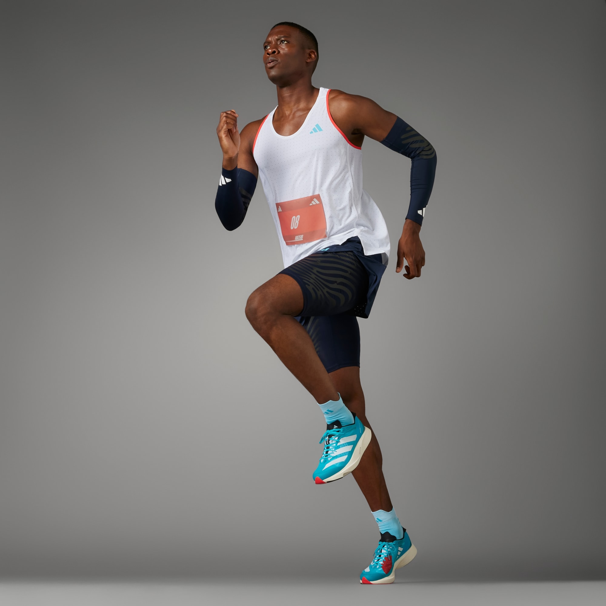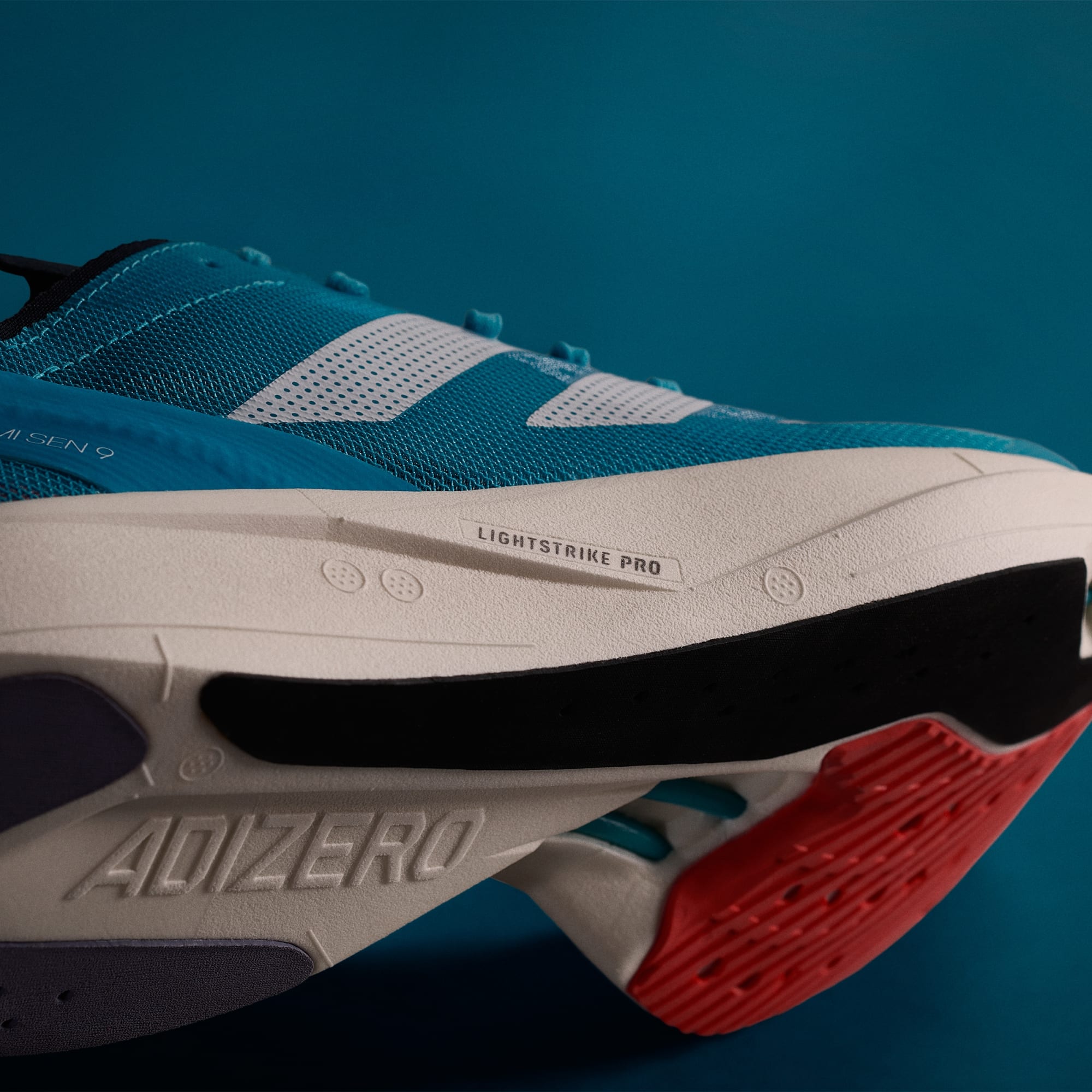 O cabedal de malha elástica leve e respirável combinado com uma nova versão do ajuste do calcanhar e do mediopé do Adizero para firmar o pé.