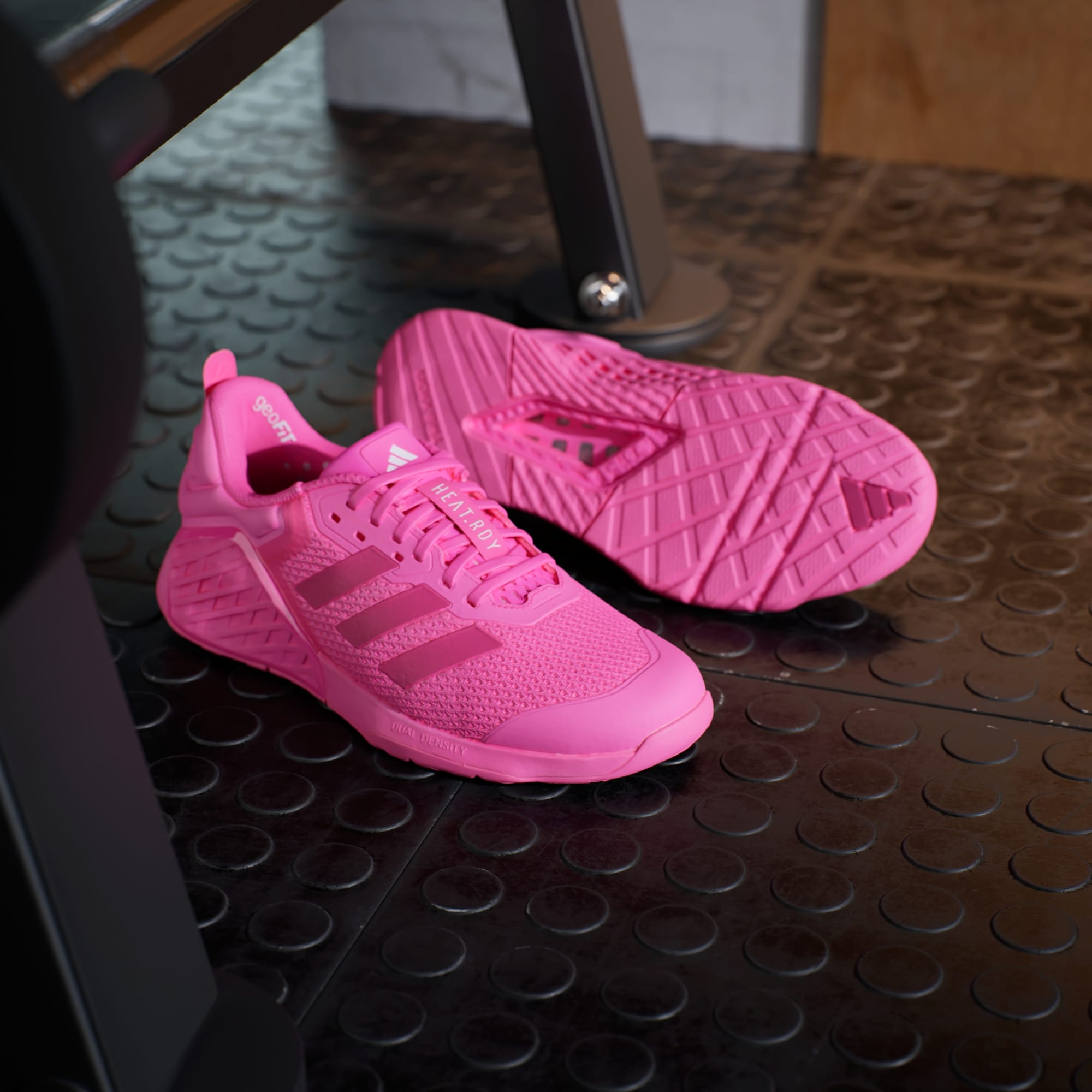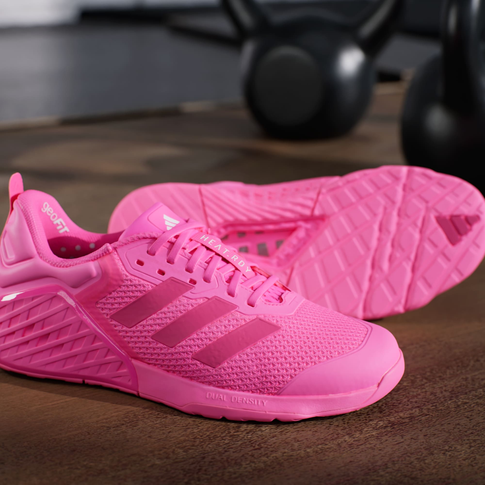 A tecnologia GeoFit da adidas inclui vários amortecimentos estrategicamente posicionados ao redor da área do tornozelo. Ela é usada na estrutura do calcanhar do tênis adidas Dropset - no suporte e contenção para manter os calcanhares na posição correta para fazer levantamento. Um bom tênis para treinos de força exige que seus pés permaneçam firmes no chão, pois você não quer que seus pés deslizem enquanto levanta pesos pesados. A tecnologia GeoFit também é usada em powerlifting e cross training pelo mesmo motivo.