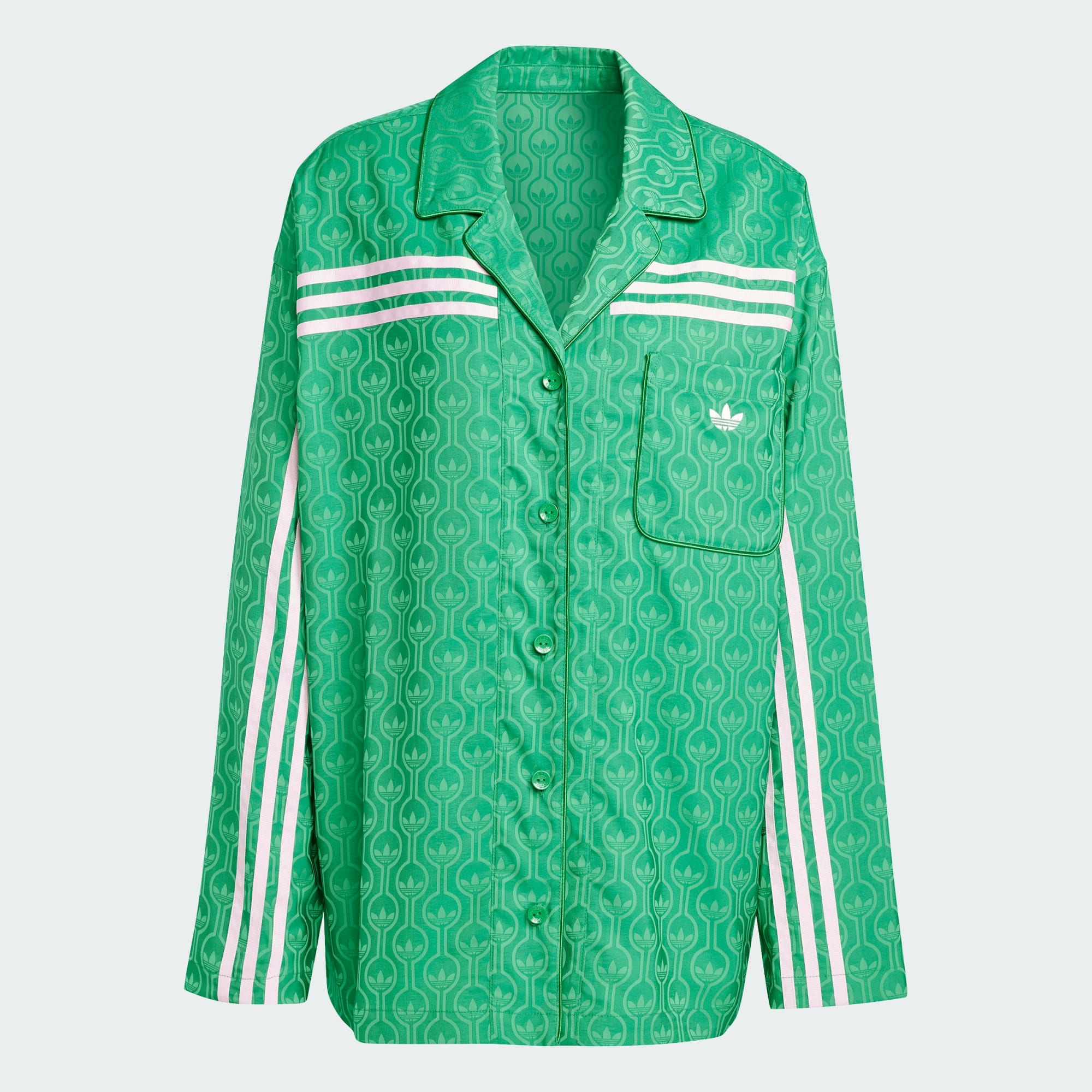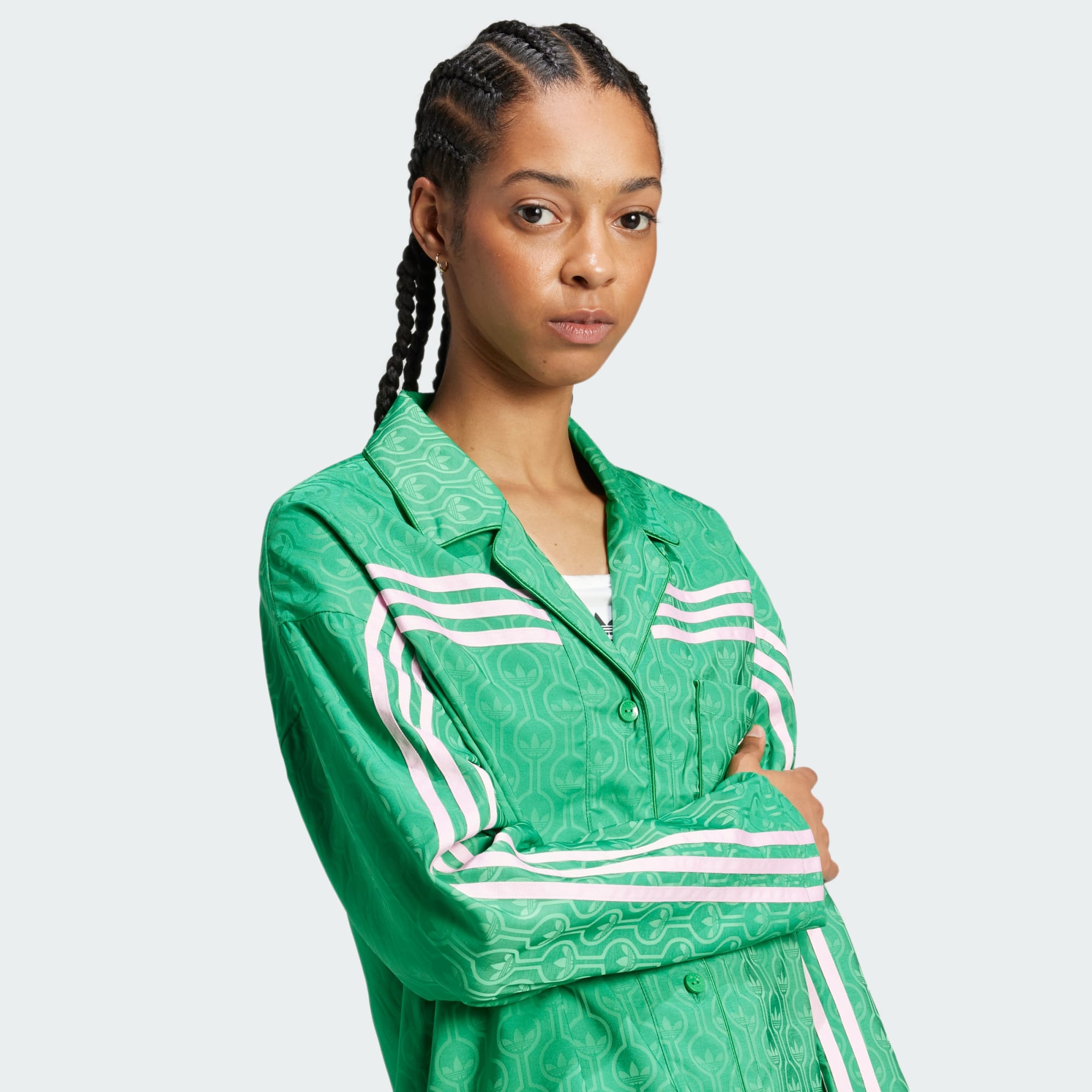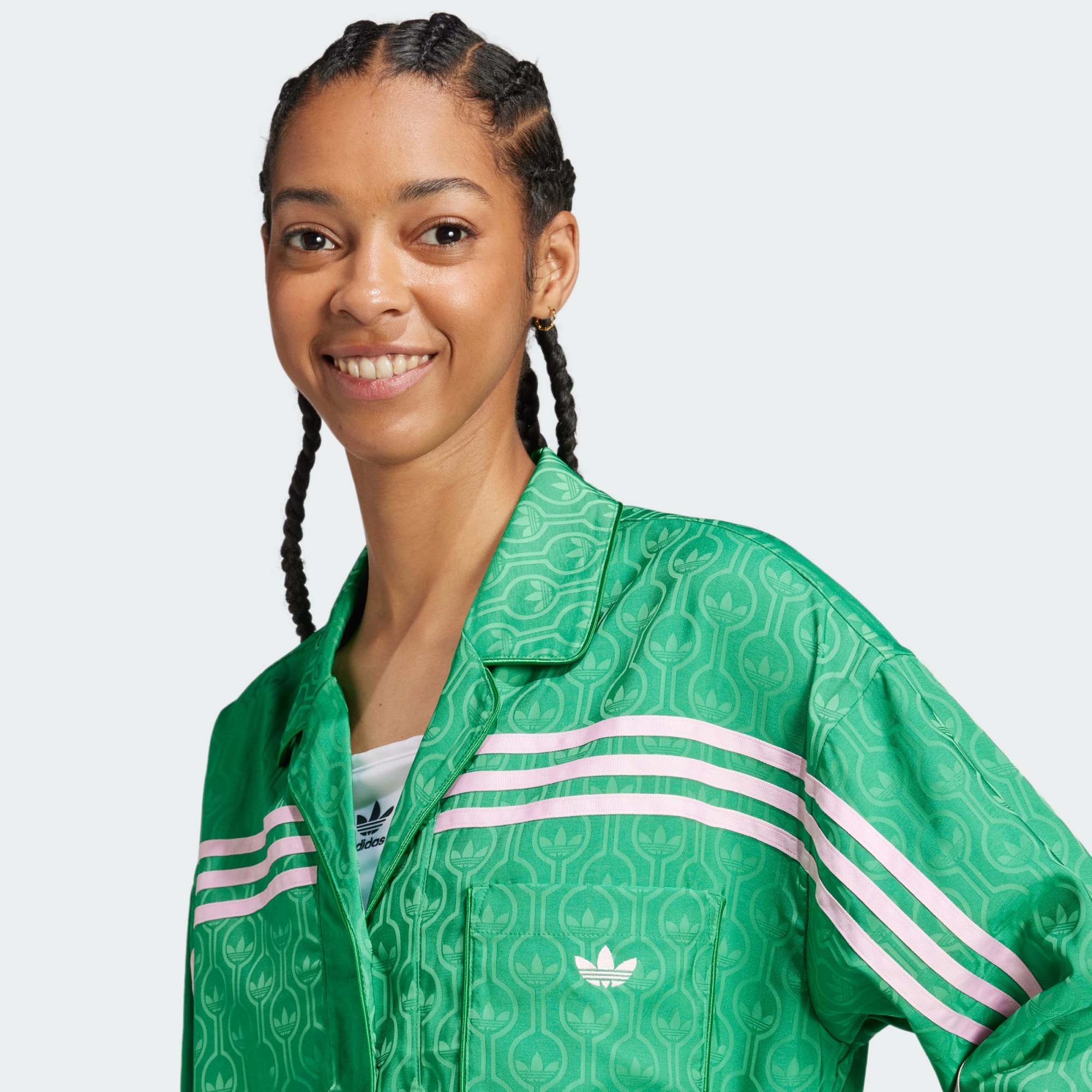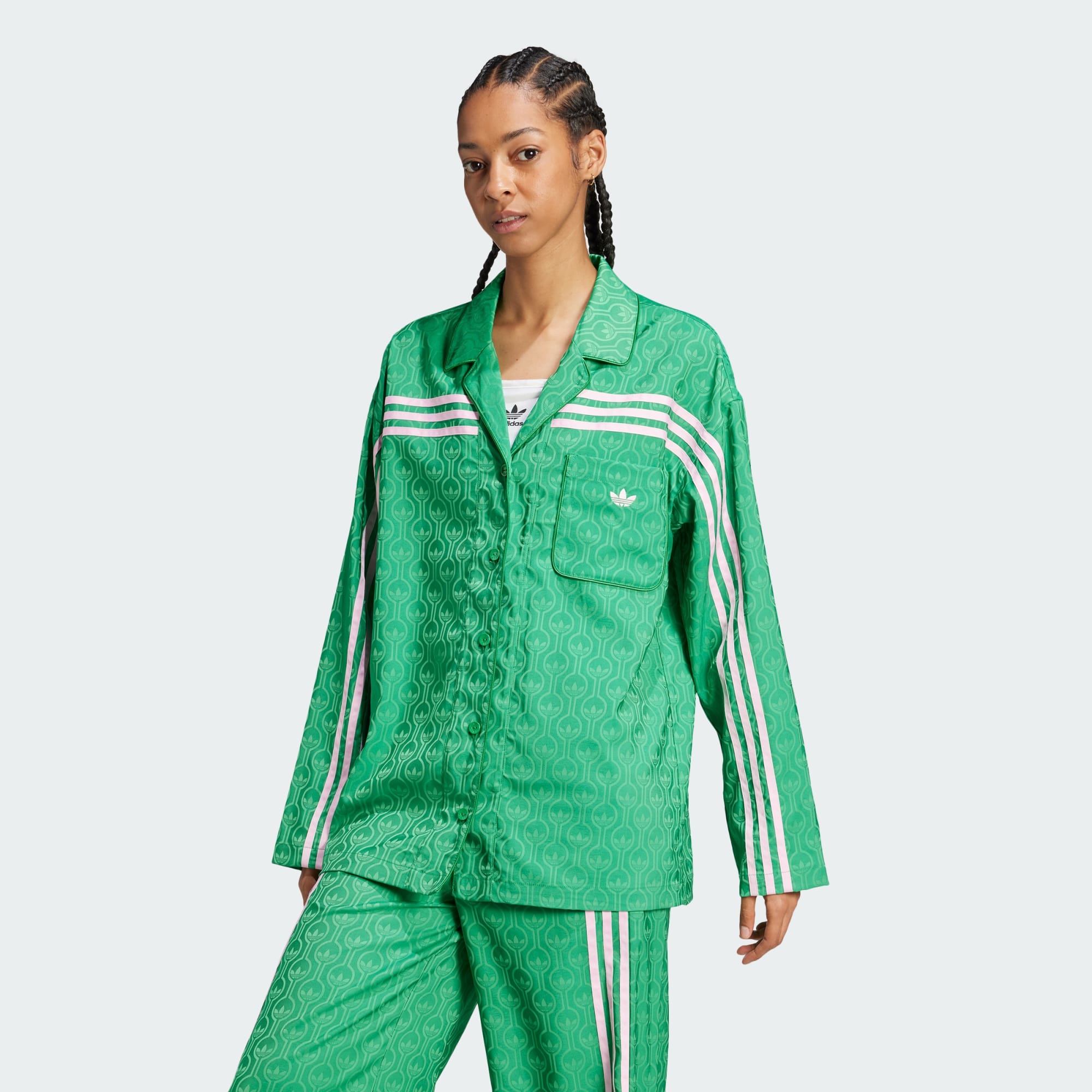 Dos arquivos à cena urbana atual, esta camiseta adidas Originals dos anos 70 combina vibes vintage com sensibilidades elegantes no inverno. Feita de jacquard de cetim, ela é macia e flexível, com design de monograma do Trefoil. A jaqueta de modelagem folgada tem botões na frente, com lapelas que talvez não sejam tão largas quanto um verdadeiro terno de lazer dos anos 70, mas estão por perto. As Três Listras contrastantes percorrem a frente das mangas e cruzam o peito, dando um toque inesperado ao símbolo icônico. Combine a calça de pijama da mesma forma e monte o seu look, ou misture-a com diferentes texturas e cores, como uma calça jogger de malha elástica ou um jeans estiloso.