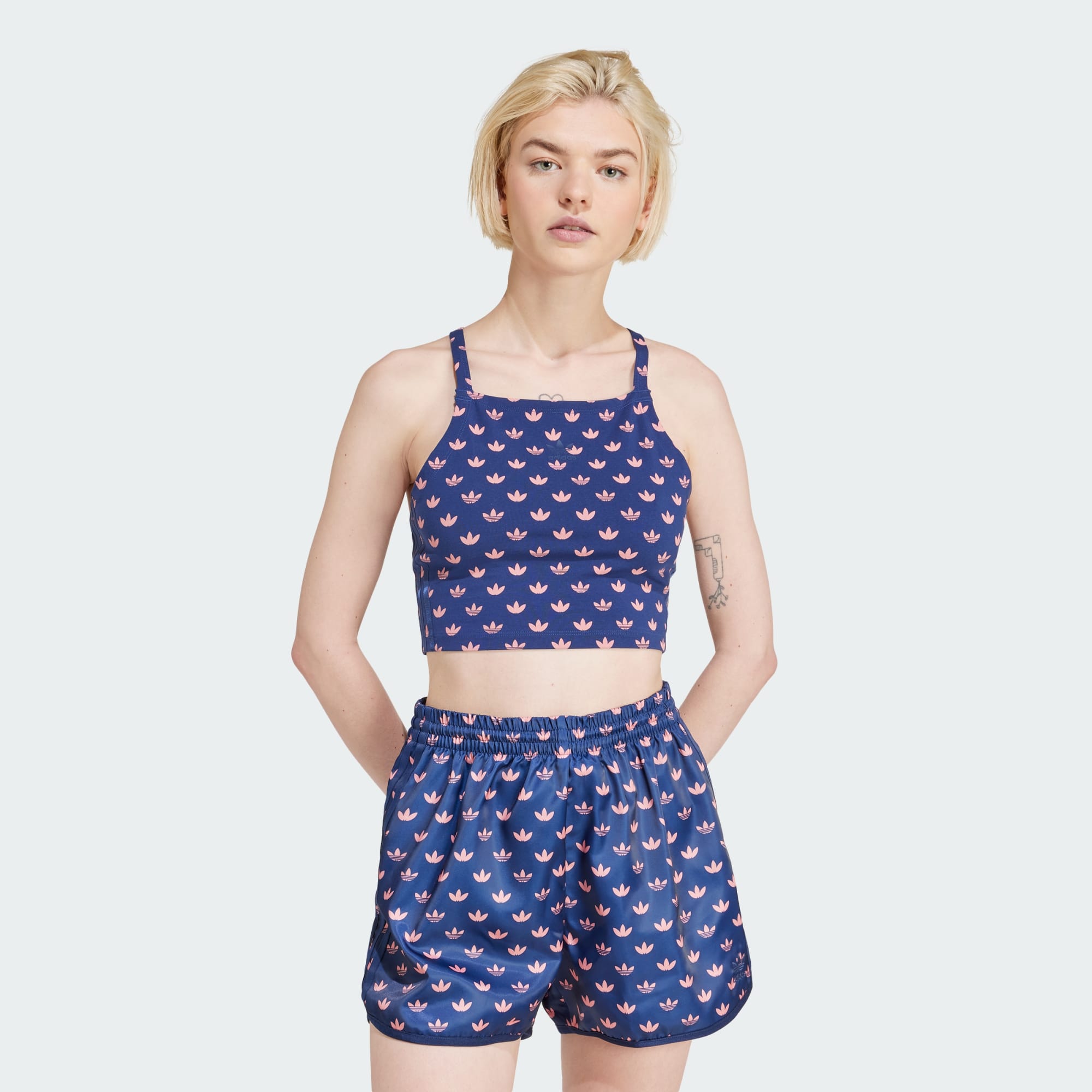 Este top cropped adidas reimagina o icônico Trefoil em uma estampa de monogramas de inspiração retrô que adiciona um toque pop a qualquer look — e em todas as ocasiões. Combine com peças de cintura alta para um visual completo ou simplesmente vá em frente, abrace um estilo descontraído e mostre um pouco mais de pele. O detalhe das alças cruzadas na parte de trás já faz um pouco disso por você. O algodão deste produto foi obtido por meio da Better Cotton. O algodão Better Cotton é obtido por meio de um modelo de cadeia de custódia chamado de equilíbrio de massas. Isso significa que o algodão Better Cotton não é rastreável fisicamente até os produtos finais. Saiba mais aqui: https://bettercotton.org/who-we-are/our-logo/